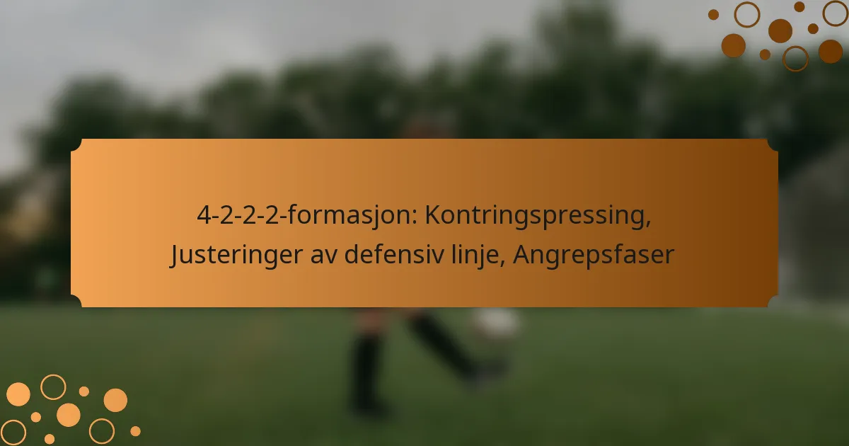4-2-2-2-formasjonen er en strategisk oppsett i fotball som balanserer defensiv styrke med angrepspotensial, med fire forsvarsspillere og to par midtbanespillere og angripere. Ved å bruke soneforsvar kan lag effektivt forsvare spesifikke områder, noe som gir en fleksibel respons på motstanderens angrep. Denne formasjonen legger også til rette for å skape overbelastninger, noe som gjør at lag kan overmanne motstanderne i nøkkelområder, og dermed forbedre kontrollen over spillet og øke sjansene for scoring.